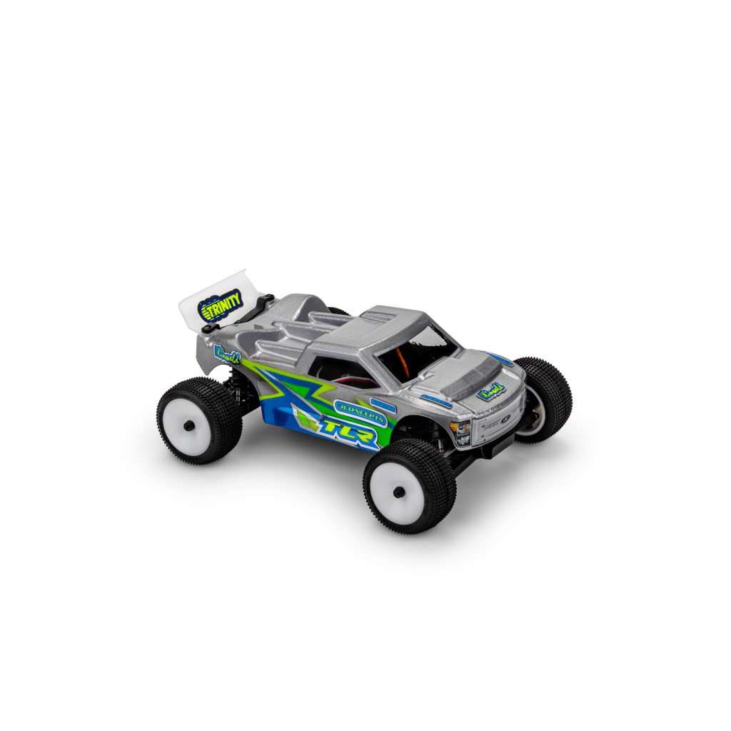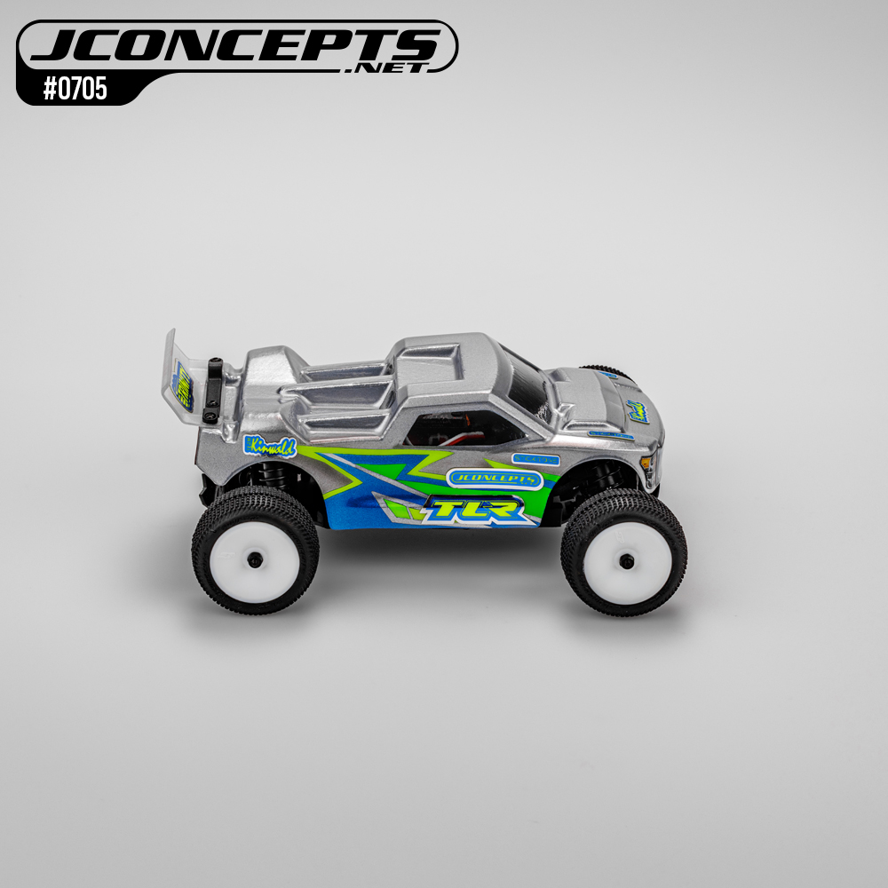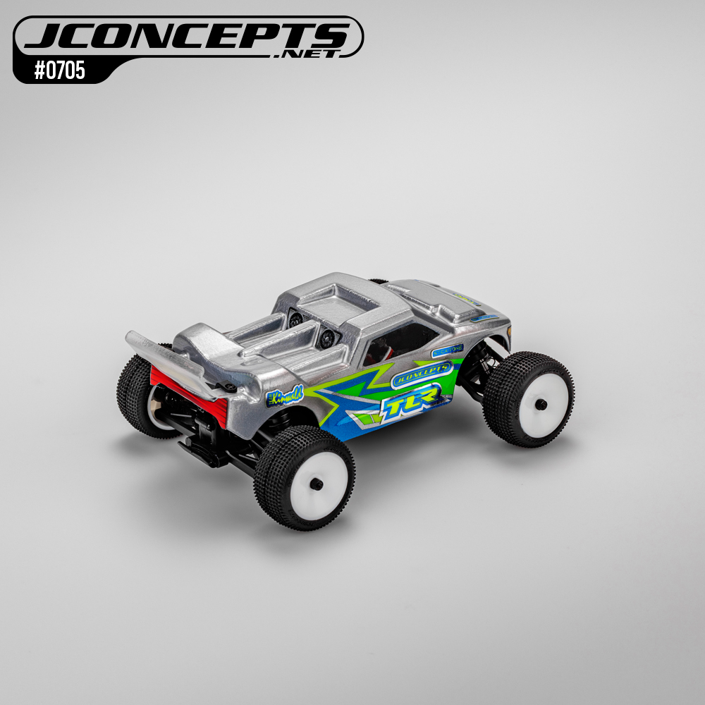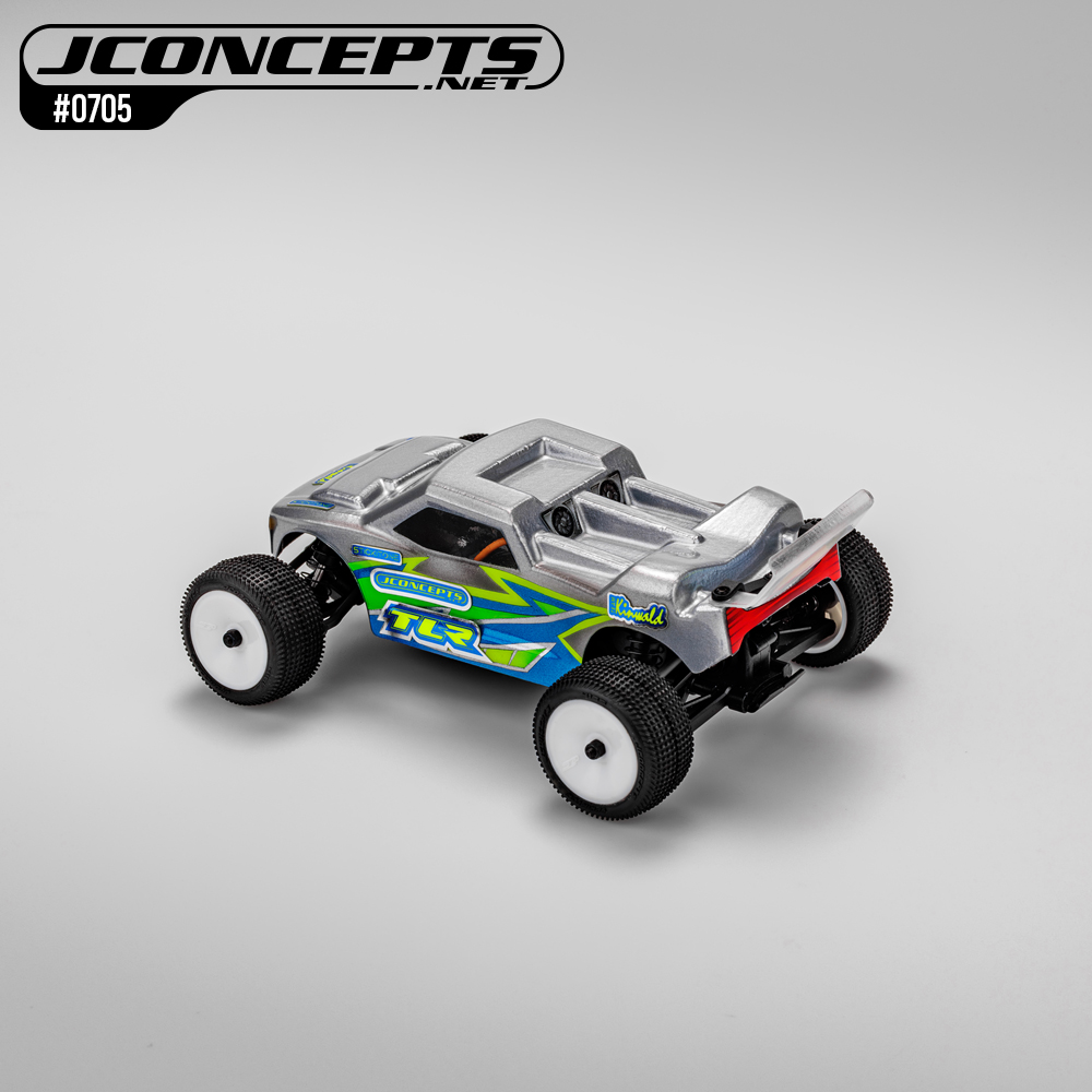 The Micro-T is here and is now covered with the famed JConcepts Finnisher body. The #0705 body incorporates pre-dimpled locations for the hottest micro truck on the market. The clear body has a slight cab forward, raked windshield and aggressive stance that highlights a performance-oriented core. The front hood scoop allows plenty of clearance for mini front-end geometry and body mounts while smoothing out the front down force area. Front chin spoiler, headlight, and grill protect the front-end from unwanted up-drafts during flight while the supplied decals stand-out like an 18-wheeler.
