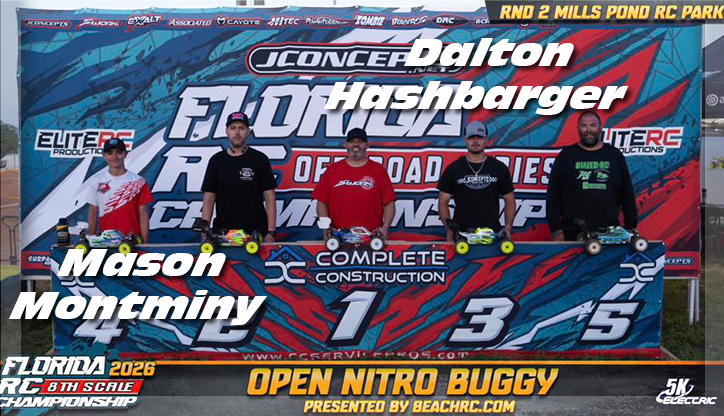 Heading further south we now visit Mills Pond RC Speedway in Fort Lauderdale, FL. This track hosted Round 2 of the Florida RC Championships last weekend, and team driver Mason Montminy let us know that he finished 8th in Open 1/8 Electric Buggy along with a 4th place finish in Open 1/8 Nitro Buggy! Joining him on the podium in 3rd place was fellow JC driver Dalton Hashbarger!