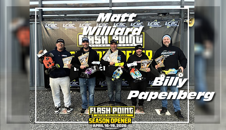 Team driver Matt Williard reported that he set the TQ in the 40+ 1/8 Nitro Buggy class then drove on to take that win, plus he picked up another W in the 40+ 1/8 Electric Buggy class! Joining him on the nitro buggy podium in 5th place was fellow JC driver Billy Papenberg!